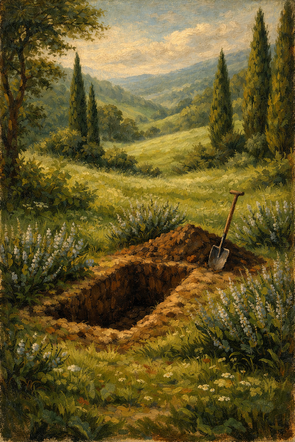 L’immagine mostra una tomba appena scavata in un paesaggio silenzioso di rosmarino