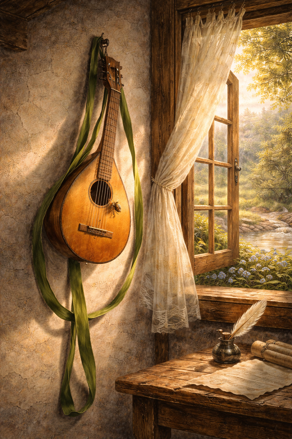 Symbolklang: „Laute“ ohne Pantomime, dafür farbige Klangvorstellung im Klavier (zartes Arpeggieren, dolce-Legato). Das „grüne Band“ erhält kleine Leuchtpunkte; bei „bange/durchschauert“ diskrete Trübung – ohne dramatische Geste.