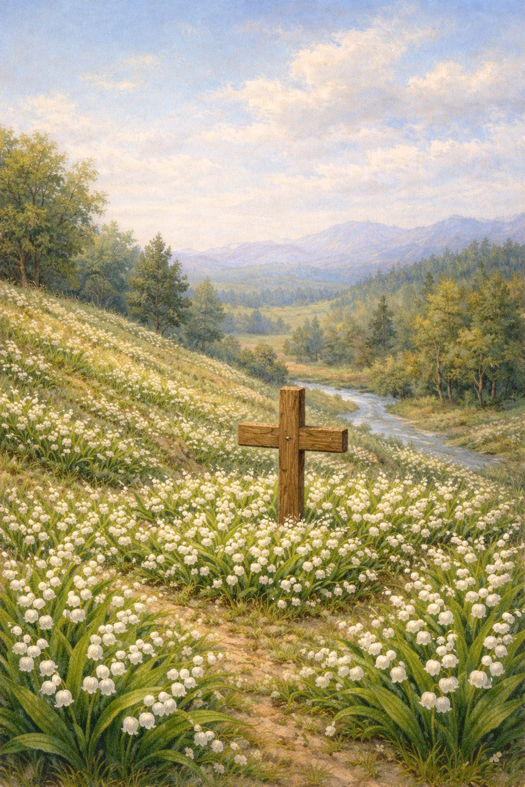 Die Darstellung zeigt ein Grab in einer stillen Landschaft aus Maiglöckchen. Damit wird