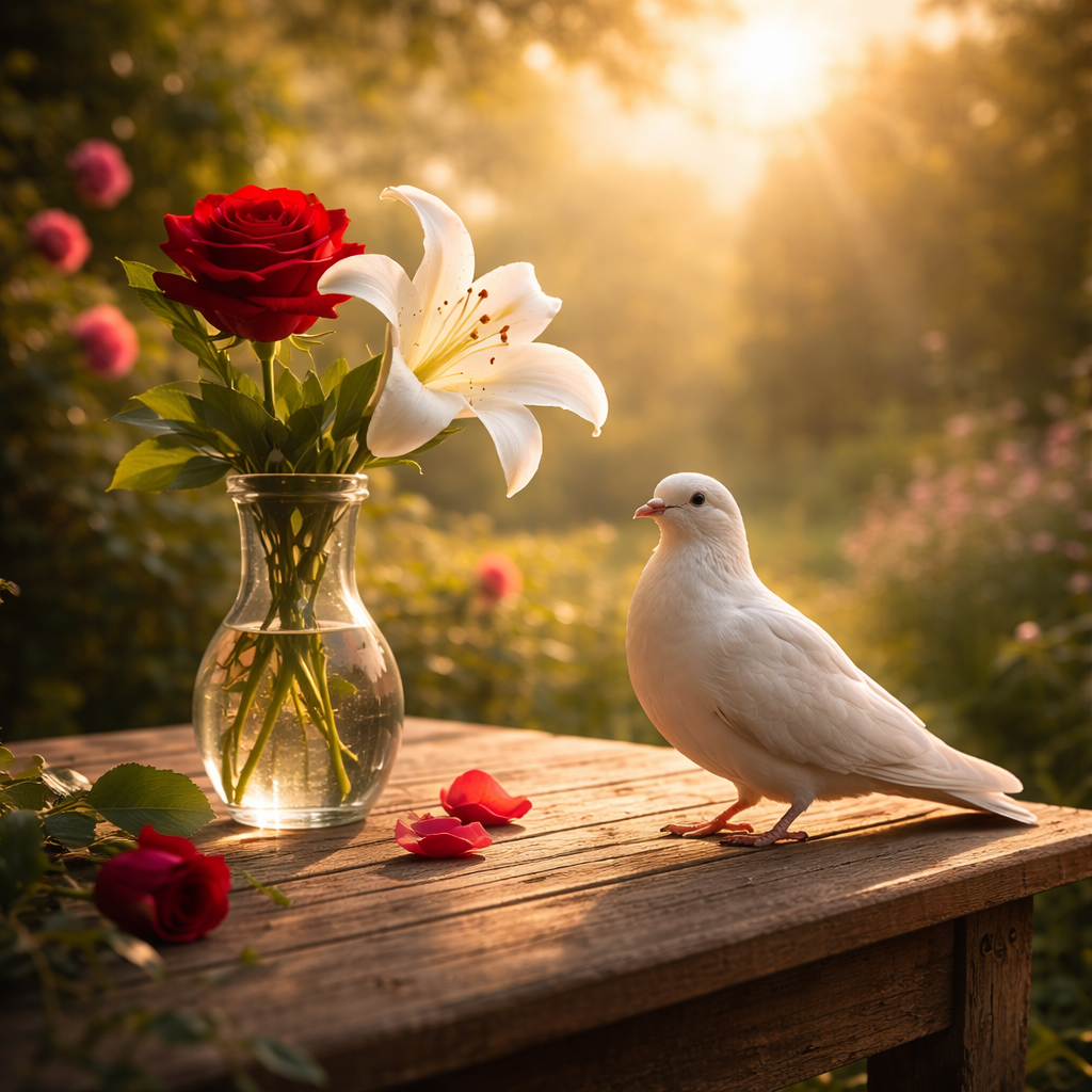 Neben der Vase sitzt eine weiße Taube. Ihr Gefieder fängt das Sonnenlicht ein. Sie wirkt ruhig, fast würdevoll, als sei sie Teil einer bewusst komponierten Ordnung.