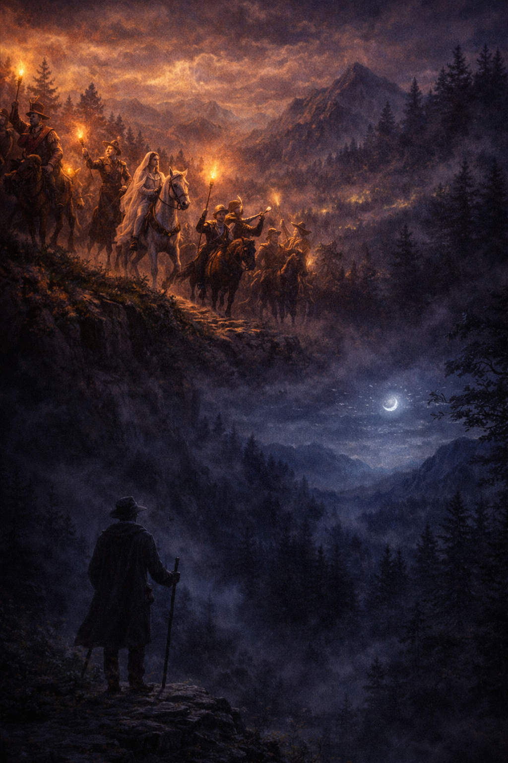 Der erste Vers beschreibt eine „Hochzeit“ – Bild von Gemeinschaft und Festlichkeit. Doch sie ist eingebettet in Natur: „den Berg entlang“ bewegt sie sich halbwegs wild.
